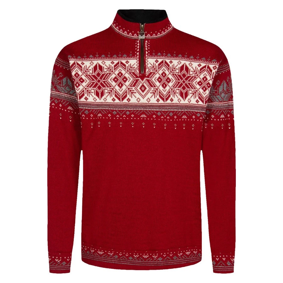 Un pull unisexe intemporel inspiré des motifs traditionnels norvégiens, avec une garniture en cuir d’élan le long de la fermeture éclair.
