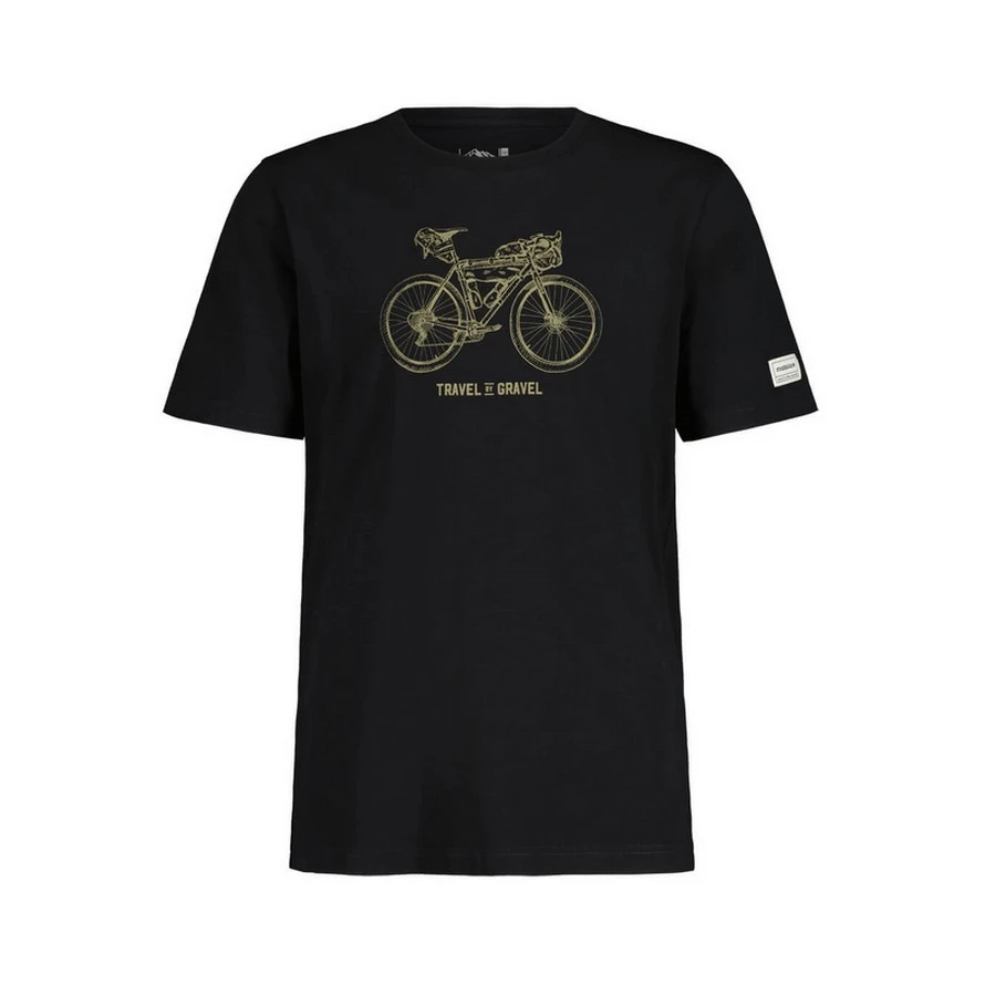 T-shirt décontracté en coton biologique avec une illustration de vélo en gravier emballé et un imprimé « Travel by Gravel ».